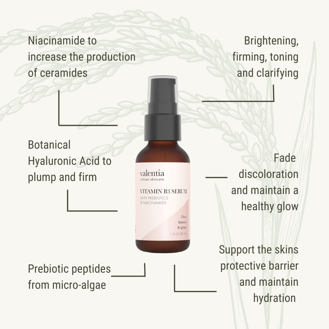 For repair, apply a thin layer of Valentia Vitamin B3 Serum to nose, chin, cheeks, and forehead.