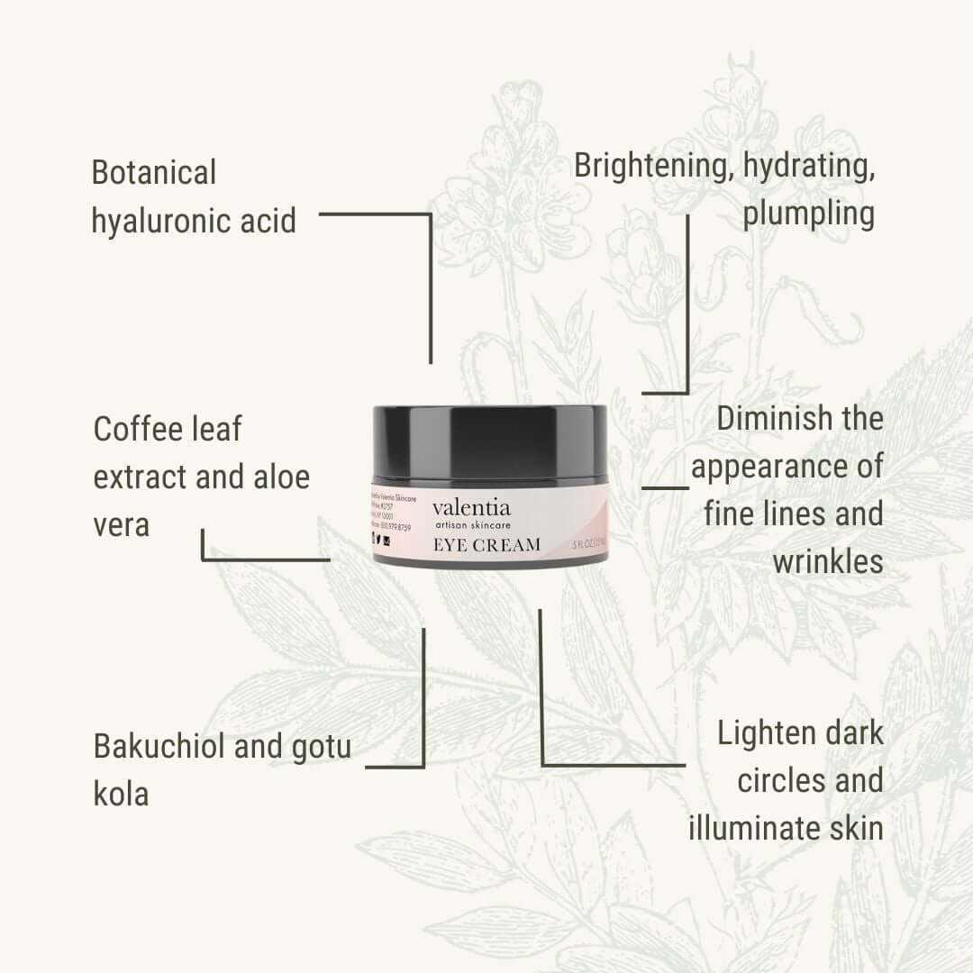 Valentia Eye Cream is cruelty free, vegan, paraben free, phthalate free, mineral oil free, formaldehyde free, and PEG free, and is made in small batches for freshness.
